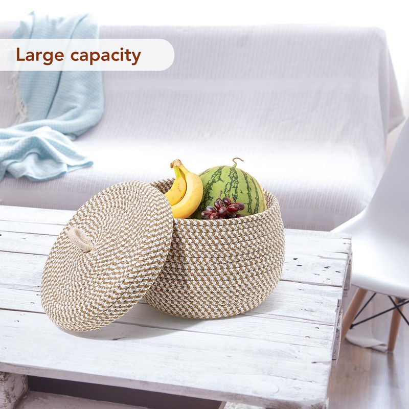 This cotton thread storage basket has a minimalist design, a round shape a stylish aesthetic that fits seamlessly into home decor. Decorative baskets with lids can help you organise rooms, keep dirt away better clean.