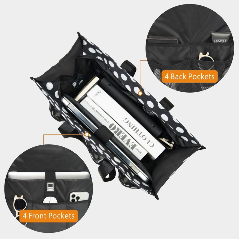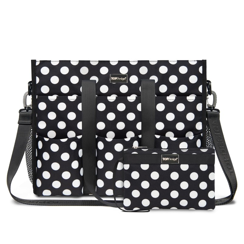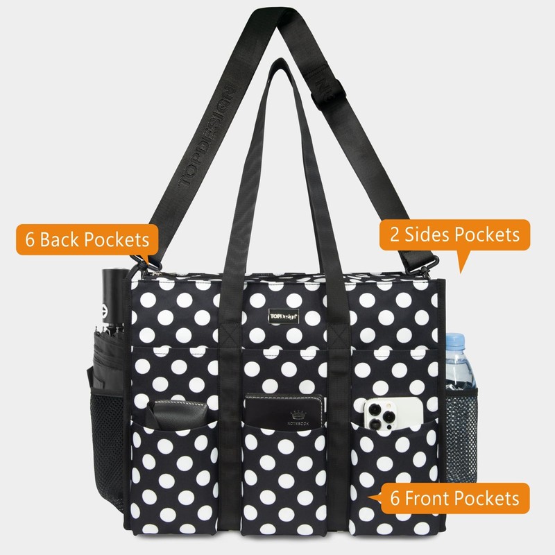 TOPDesign Utility Water Resistant Tote Bag with 22 Exterior & Interior Pockets, Top Zipper Closure & Thick Bottom Support (Polka Dots)
