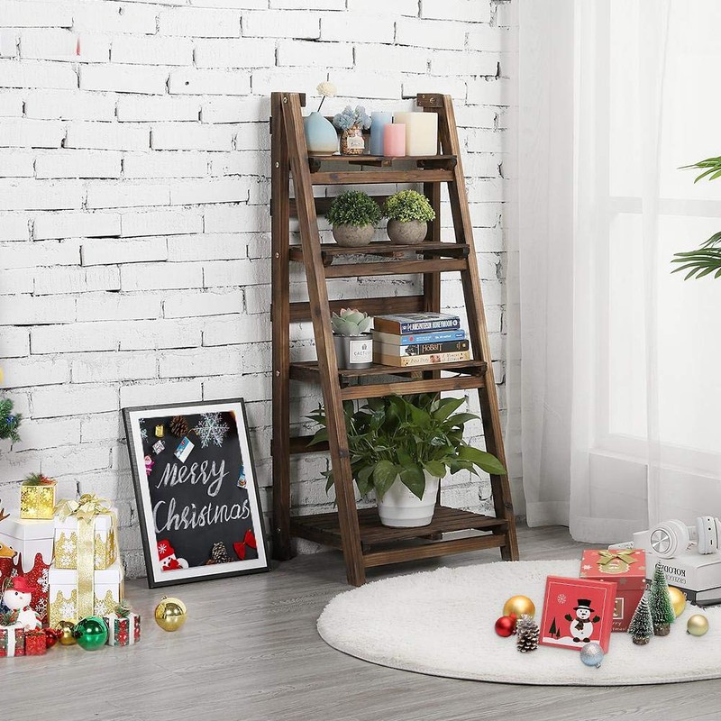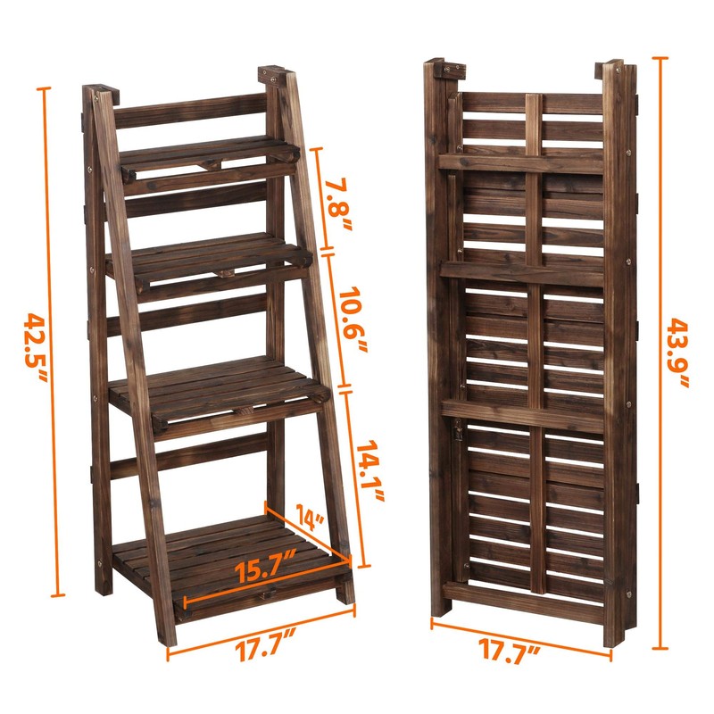 Quick overview: Want to introduce some fresh elements to the living room? Topeakmart wooden plant stand is definitely a unique and practical accessory to light up the room! Our wooden flower stand is crafted out of 100% fir wood. With selected materials and solid structure, this flower rack is expected to last for many years to come without much maintenance. Space-saving foldable design makes the storage of shelf a piece of cake. It can slide into any narrow space in your house when not in use, and can be conveniently transported and carried outside for flea markets. Topeakmart versatile and practical ladder shelf works perfectly as a display stand for plants, photos, handicraft, books in the living room, patio, balcony, and also can serve as a fancy storage shelf for toiletries, towels, hats in the bathroom, hallway, bedroom, kitchen, etc. **Specifications:** \- Materials: varnished fir wood, metal hardware \- Unfolded dimension: 45 x 35.7 x 108 cm / 17.7 x 14 x 42.5’’ (LxWxH) \- Folded dimension: 45 x 9 x 111.5 cm/ 17.7 x 3.5 x 44’’ (LxWxH) \- Tier Size (top down): 14 x 40 cm/ 5.5 x 15.7’’; 20 x 40 cm/ 7.9 x 15.7’’; 27 x 40 cm/ 10.6 x 15.7’’; 36 x 40 cm/ 14.2 x 15.7’’ (LxW) \- Max. Load Capacity in Total: 35 kg/ 77 lb \- N.W.: 3.9 kg/ 8.6 lb \- G.W.: 5.6 kg/ 12.3 lb \- Color: natural wood \- Package included: 1 x Foldable Flower Stand , 1 x Instruction Note: Please place relatively heavy items on the lower tiers for added stability and safety.