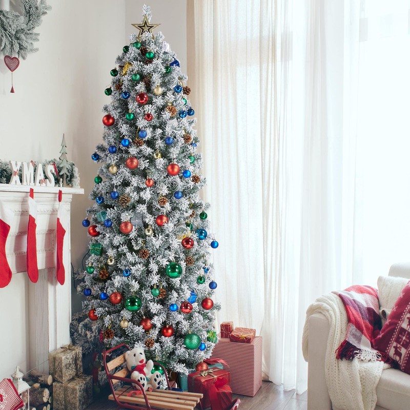 - 【Specifications】Materials: PVC, Iron; Category: Flocked Pencil Prelit Spruce; Total Tips Count: 814; Total Lights Count: 250; Color: Green+White; Overall Dimension: 31″ x 72″ (Dia. X H); Stand Dimension: 20″ x 5.5″ (Dia. X H); Diameter of the Trunk Pole: 1″