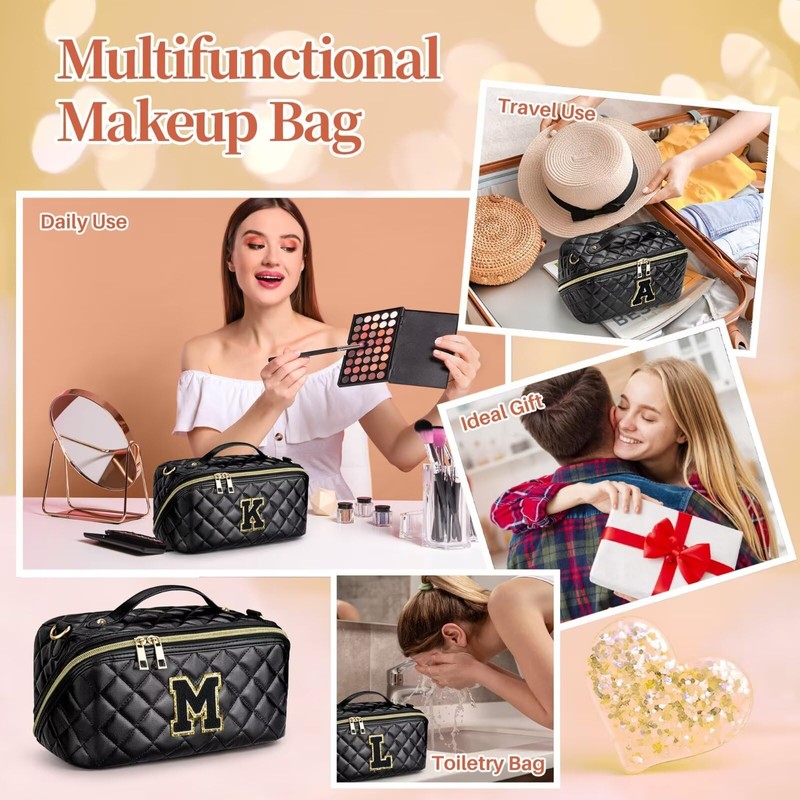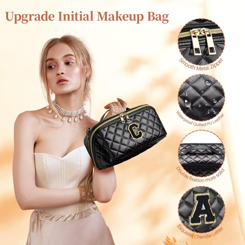 TOPEAST - Bolsa de maquillaje para mujer, con inicial, personalizable, bolsa de maquillaje de gran capacidad, bolsa de aseo de piel acolchada con asa divisoria, Negro -, C