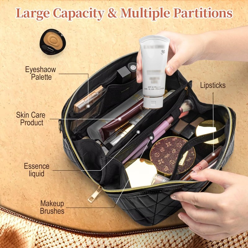 - Bolsa de maquillaje plana con cambio de juego: esta bolsa de maquillaje de viaje con apertura ancha diseñada para colocarla plana, apertura grande de 180° proporciona una visión general clara de todo tu contenido. La cierre de doble aleación garantiza una suavidad de recogida y almacenamiento. Accede fácilmente a tu maquillaje sin tener que cavar a través de una bolsa desordenada. Además, el asa superior y la correa desmontable te permiten sostener la bolsa o transportarla sobre el hombro como quieras.