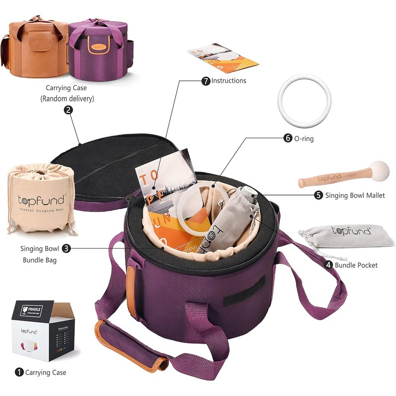 TOPFUND quartz crystal singing bowls are produced with the very high quality quartz. TOPFUND crystal singing bowls and crystal singing bowl set are handcrafted grinding and polishing chakra tuned. They are fired at extremely high temperatures until they fuse, forming quartz glass. Some formations may occur during the firing process including bubbles, lines, and spots. These features are perfectly natural and do not affect the sound or performance of the bowl in any way. TOPFUND only produces the highest quality quartz singing bowls and accessories with the highest quality standards in the world. We have sorted our crystal singing bowls by both sizes and by the dominant note produced by the singing bowl. While larger singing bowls tend to produce notes from deeper octaves, all singing bowl meditation size categories contain a variety of possible notes and some notes are more common in certain size categories. We are constantly updating our crystal singing bowls and crystal singing bowl set inventory so please subscribe to our store to check for note and size availability. The crystal singing bowl is a high-quality fragile instrument, but with proper handling, it can remain beautiful and viable for a lifetime. Always handle your crystal singing bowl with the utmost care and take special precautions while transporting or storing it. It is also imperative that appropriate strikers, rubber mallets, and O-rings are used when your crystal singing bowl is played. We suggest that the crystal singing bowls are always played at a minimum of 10 inches from a person痴 head. Also, avoid playing these crystal bowls within 10 inches of each other as their intense vibrations can lead to shattering or breakage. Every TOPFUND singing bowl and crystal singing bowl set come with professional safe carrying packages, suede striker or rubber mallet and O-ring for free for sound healings chakra meditation and yoga practice.