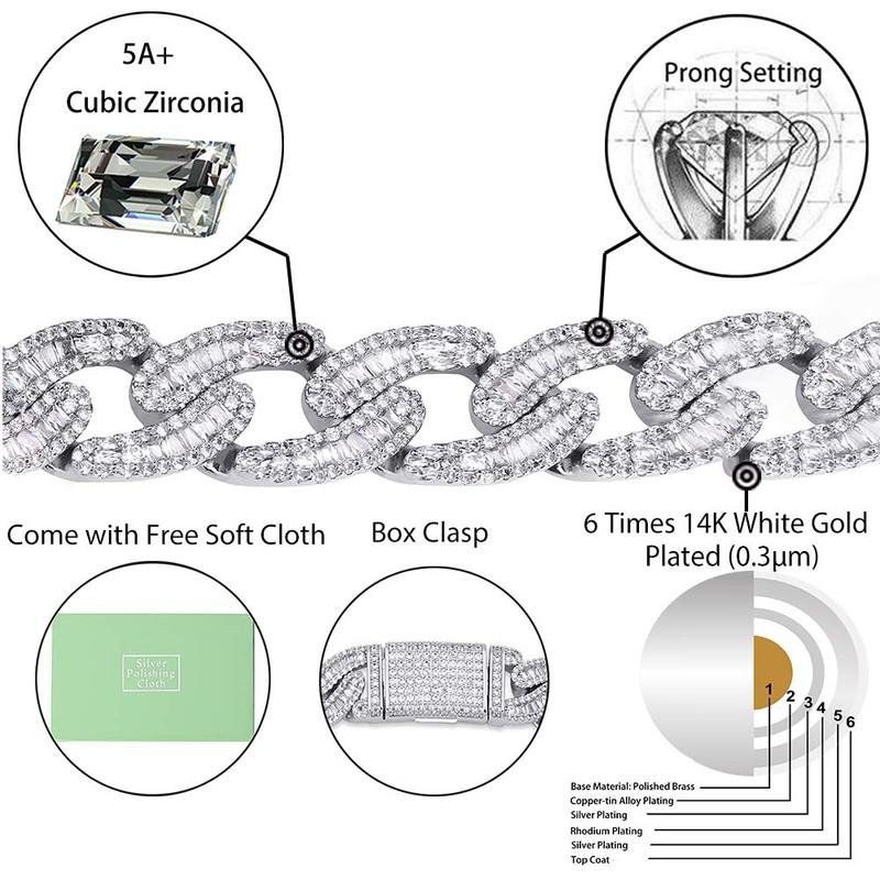 • SAFE MATERIAL AND 6 TIMES IN PLATING DO NOT FADE: We electroplated the 14K gold, white gold and rose gold for 6 times (0.3μm) over the environment brass , so it will not tarnish or fade. For the stones, we paved by hand with 5A+ baguette and round well cut cubic zirconia to get a fabulous and glistened cuban link bracelet.