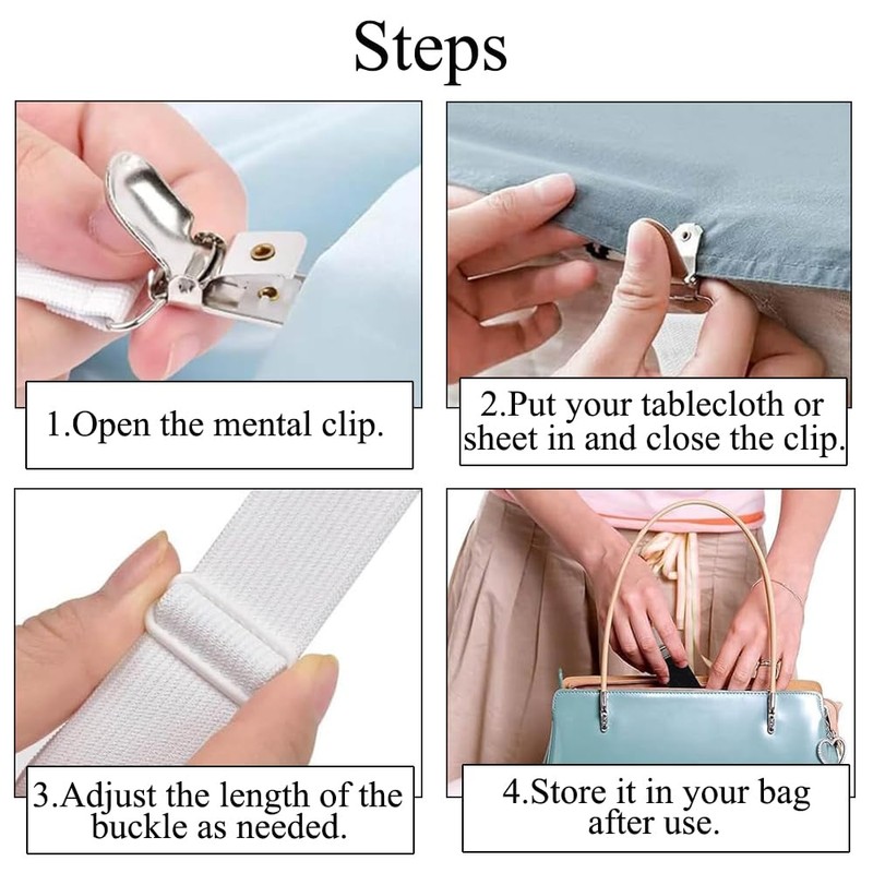 - 【Wide Application】The adjustable elastic bed sheet grippers clip is very practical and beautiful, providing stability and elegance to any table setting. The hidden strap can be used in a variety of scenarios, such as: dining outdoors, bed linens, family dining, event planning, car seat cushions, restaurants and trade shows, and more.