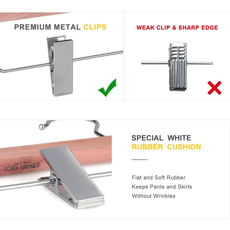 TOPIA HANGER 10 Pack American Red Cedar Natural Wooden Pants Skirt Slacks Bottoms Jeans Hangers with Metal Anti-Wrinkle Adjustable Clips, 360° Stronger Chrome Hooks - CT07P