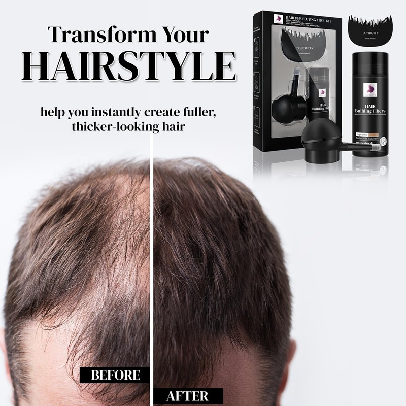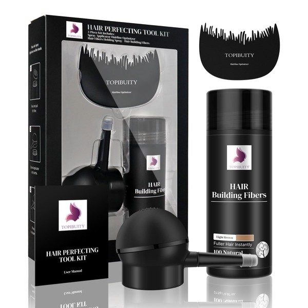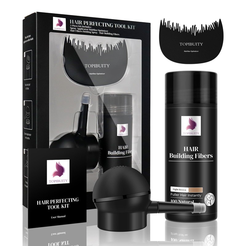 TOPIBUITY Hair Fibers & Applicator 3-in-1 Set - Natural Concealing Hair Thickening Fibers - Long-Lasting Spray with Accessory for Crisp Hairlines, Thicker Beard & Styling (light brown)