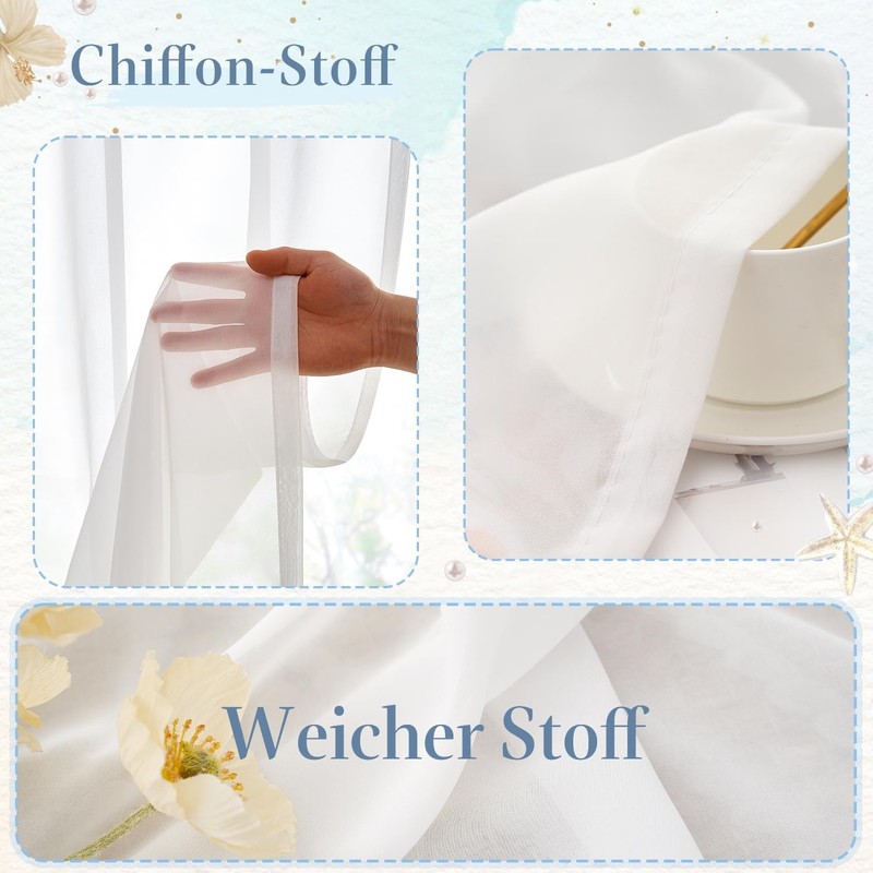 - Hochwertiger Chiffon-Stoff: Hergestellt aus feinem, luftigen Chiffon (100 % Polyester), der besonders weich, leicht und fließend fällt. Der Stoff ist halbtransparent und sorgt für eine sanfte Lichtdurchlässigkeit, wodurch eine helle und romantische Atmosphäre entsteht.