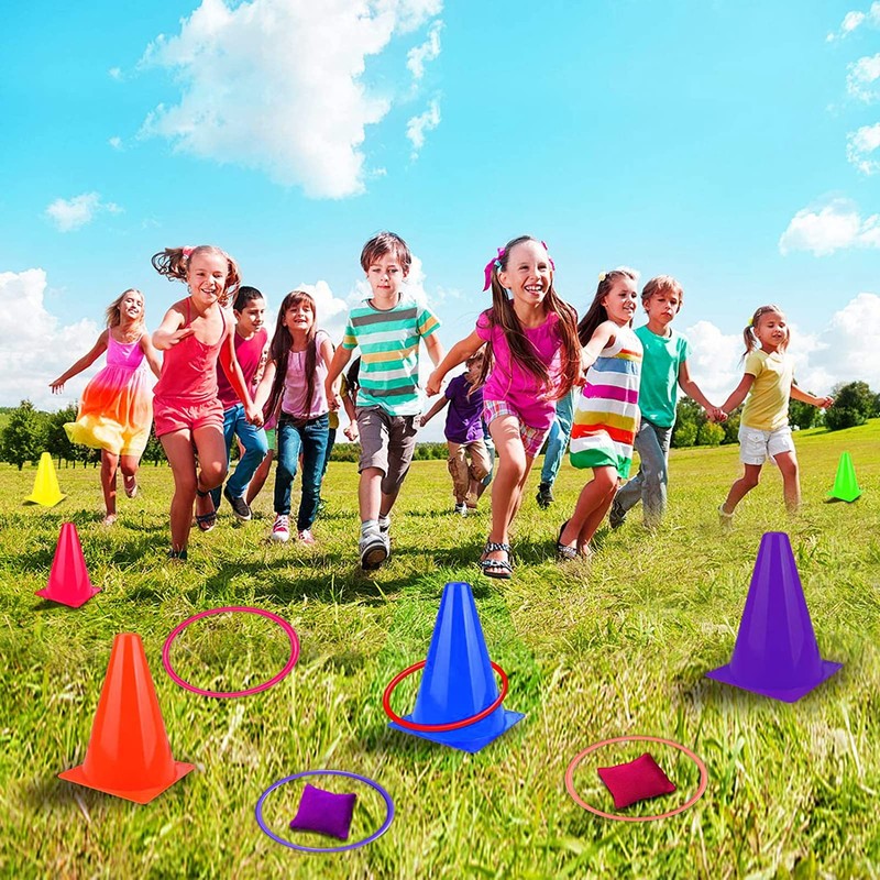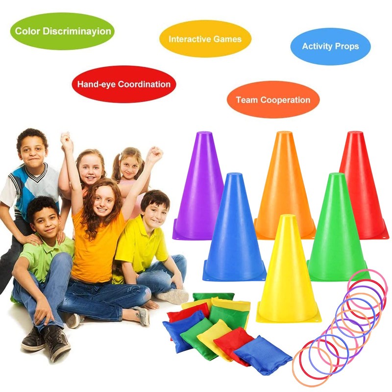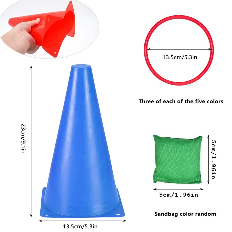 - 3 IN 1 TOSSING GAME SET Our party games will provide perfect entertainment at your outdoor party. The set includes 15 throwing rings, 10 bean bags (random colour), 6 sports training cones and a storage bag.