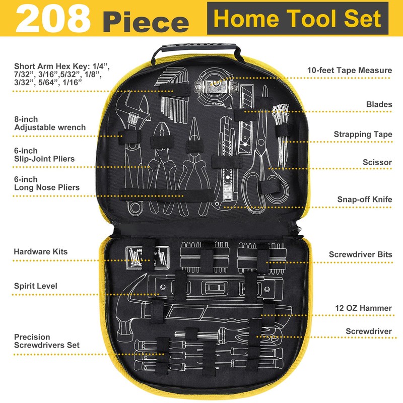 - This 208-piece home tool set with easy carrying round pouch is an excellent choice for new apartment use. It is a small tool kit contains tools for most daily household use. This household tool kit includes 12 OZ hammer, SAE long hex key, screwdriver bits, pliers set, adjustable wrench and other various tools for diy projects, daily and work use.