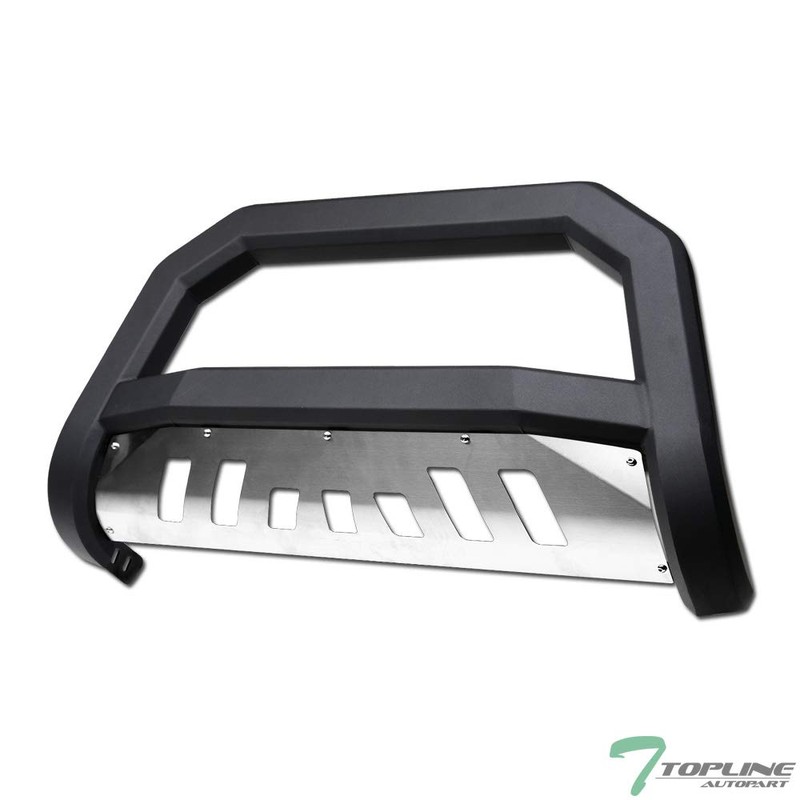 Topline Autopart Matte Black AVT Style Bull Bar Brush Push Front Bumper Grille Guard With Aluminum Skid Plate For 2007-2020 Toyota Tundra / 2008-2020 Sequoia