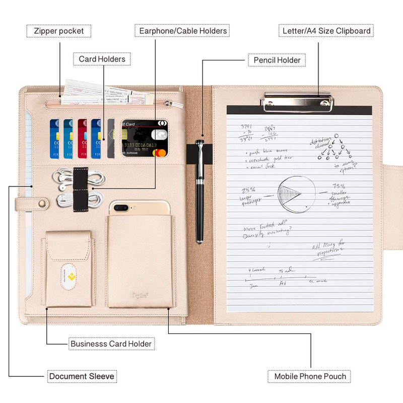 - 1. [List of writing case A4]: Toplive Multifunctional Writing Case A4: One tablet pocket, one mobile phone pocket, one extended folder, 5 card slots, one pen holder, 2 headphone box, card holder and clipboard. Fulfil your business trips, your ideas or your wishes.