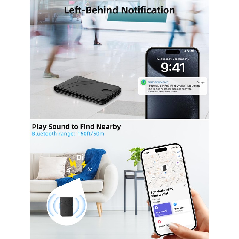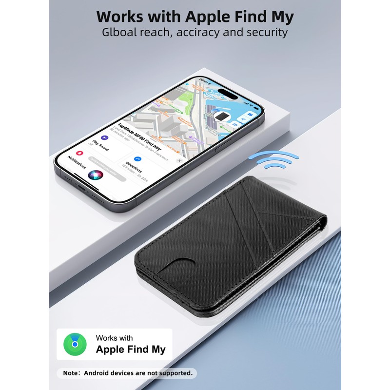 • Works with Apple Find My App The TopMade Find Wallet Stand is a newly upgraded multi-functional accessory compatible with iPhone, iPad, Mac and Apple Watch. Not only can it be used as a card wallet and phone stand, but it also features full Apple-certified Find My functionality, providing iPhone users with a new smart experience. Add it to your Apple device to view the real-time location of your wallet, play sound alerts, receive Left Behind notifications, and set Lost Mode. For connection details, refer to the User Manual included in the box (Note: Android devices are not supported.)