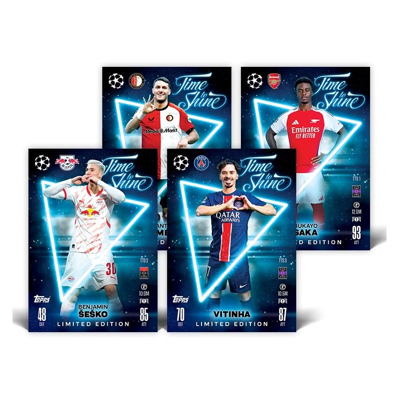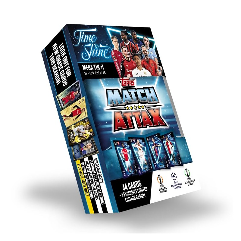 - The 'Time to Shine' Mega Tin 1 contains 44 Match Attax cards plus 4 exclusive LE's - Bukayo Saka, Benjamin Šeško, Vitinha and Santiago Giménez!