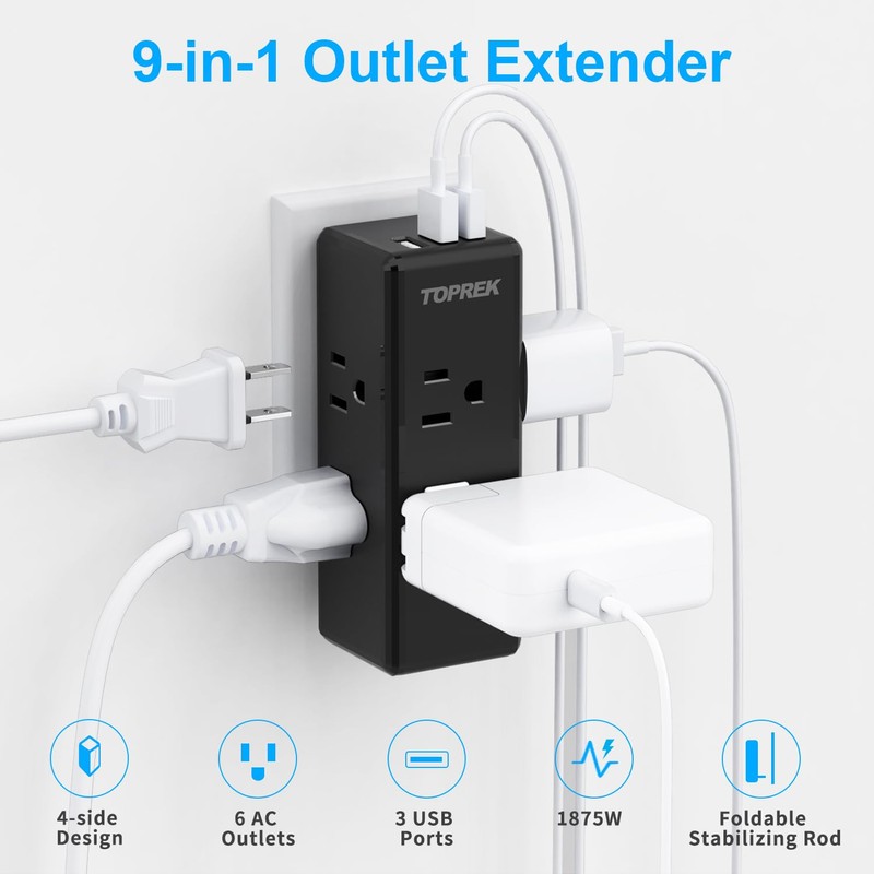 - 【9-EN-1 EXTENSOR DE TOMA DE PARED】- La toma múltiple eléctrica TOPREK puede extender la toma de pared a la estación de carga con 6 tomas de CA (1875W / 110 ~ 125V) y 3 USB (total: 5V / 3.1A), puede cargar hasta 9 dispositivos simultáneamente. Es una necesidad definitiva para las personas que tienen muchos dispositivos electrónicos, suficientes para acomodar su computadora portátil, teléfono, tableta y altavoz portátil con espacio de sobra.