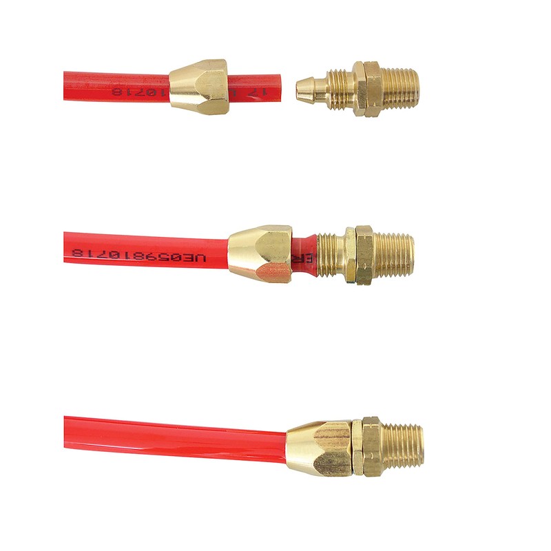 - Insert the sleeve nut over the cut end of the hose. Press in the barbed end of the fitting until it seats against the thread base. Slide the nut onto the fitting and tighten. Complete the installation by tightening the nut until it reaches the fitting body.