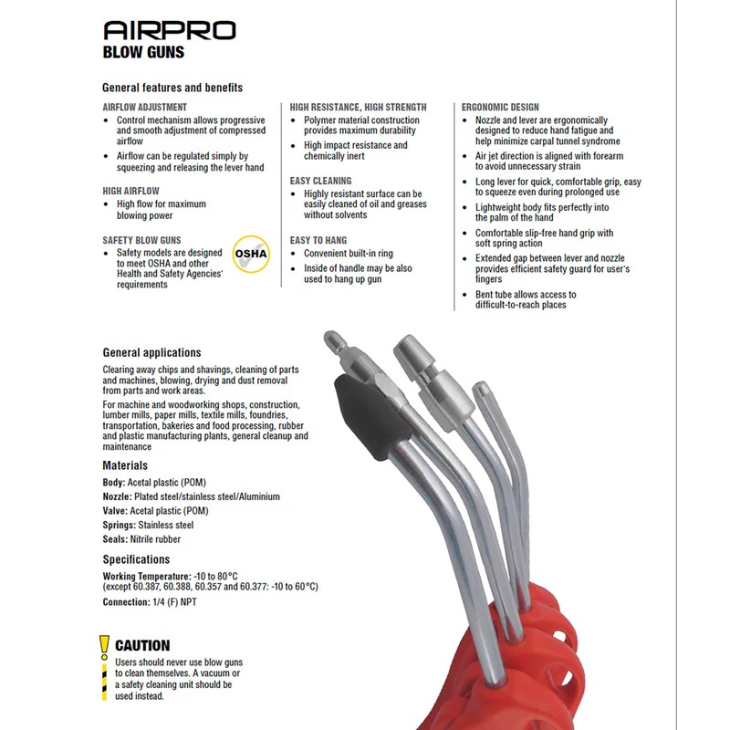 • Comfortable slip-free hand grip with soft spring action with progressive and smooth adjustment of compressed airflow. High impact resistance and chemically inert handle material.