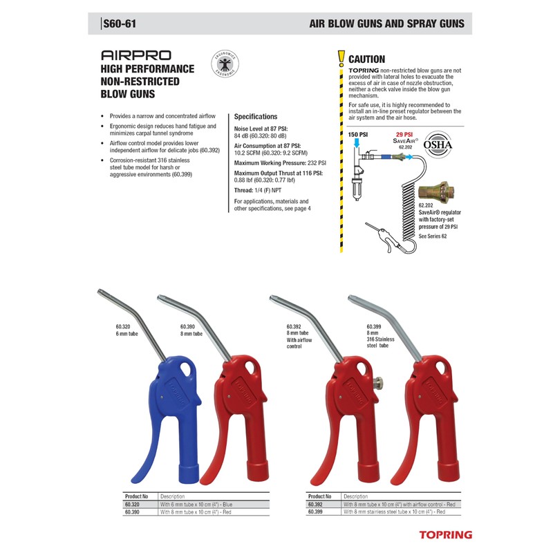 TOPRING 60.320 AIRPRO Air Blow Gun for Compressor. Non-Restricted Slim Nozzle Tip. 6 mm x 10 cm (4") Bent Tube. High-Performance Model. Series 60