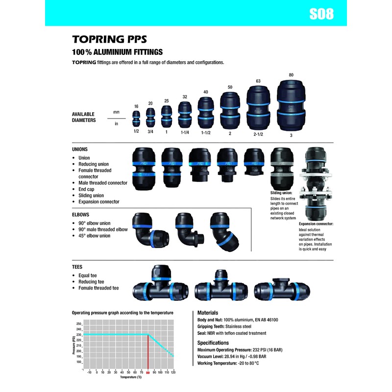 • 100% Aluminium, (EN AB 46100) Body and Nut. Stainless Steel Gripping Teeth. NBR with teflon coated treatment Seal.