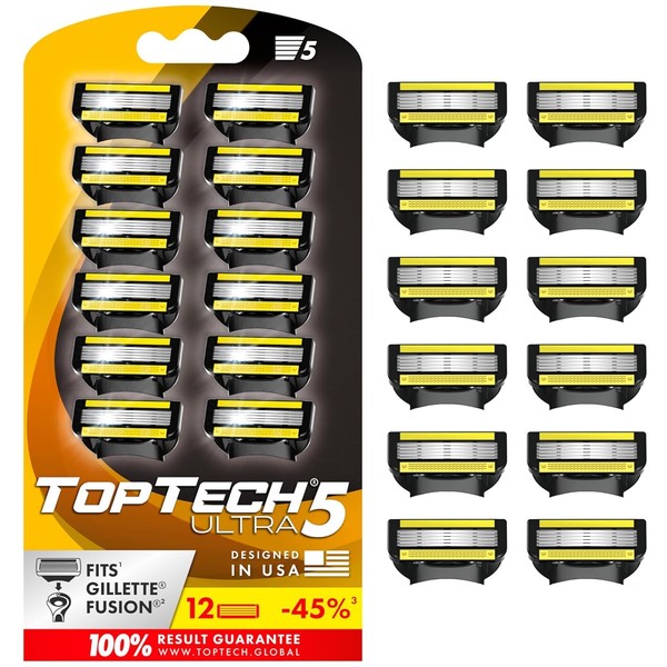 TopTech ULTRA 5 Razors for Men - Replaceable Cartridges for Manual Shaving Razor - 5 Blades Technology Refills - 12 Count Pack - Fits Gillette Fusion - Soft Shave, Sharp Blades - Cost-effective Refill