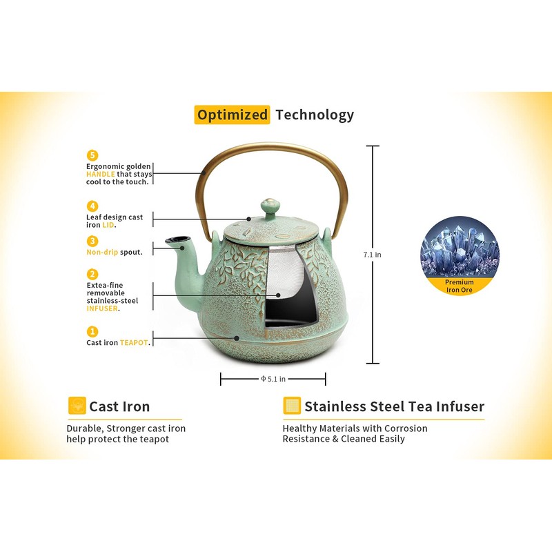 - This TOPTIER teapot is built with an infuser for loose leaf tea to maximize the flavor and aromas and has a cast iron body to preserve heat.