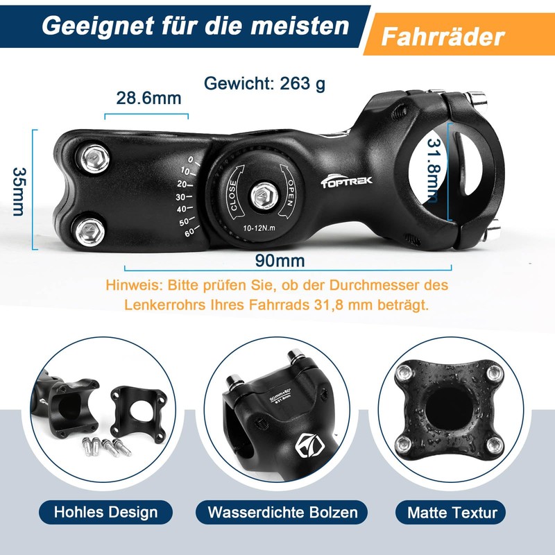 - Robust aluminium alloy: the selection of the high-strength aluminium alloys of the bicycle handlebar stem ensures a balanced ratio of strength and lightness, so that the handlebar raiser bicycle provides stable grip in all road conditions; at the same time, the overall weight of the bike is reduced, allowing faster acceleration and less effort on climbs. Compared to other materials, aluminium alloy is less susceptible to rust and corrosion and has a longer service life.