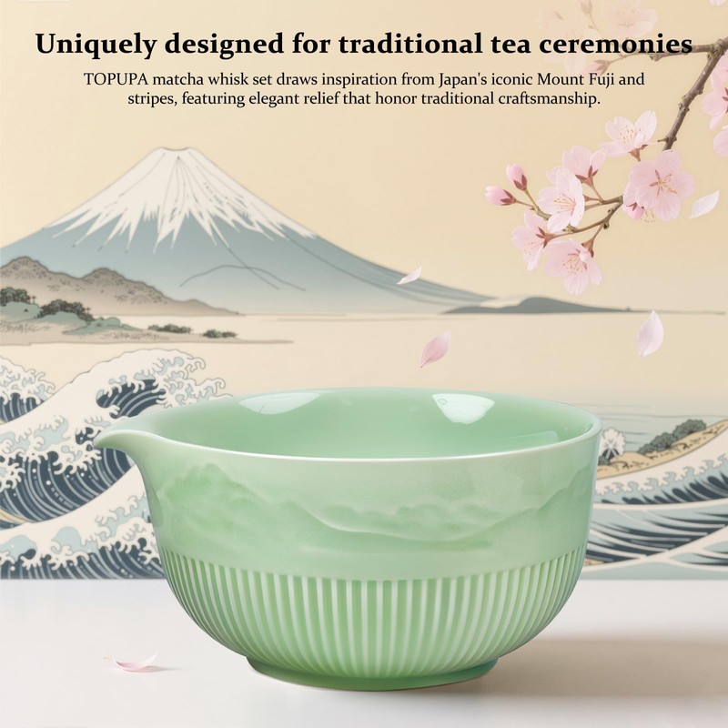 TOPUPA Matcha Bowl and Whisk Set 7PCs Includes Fuji Design 17oz Ceramic Bowl Whisk Holder Bamboo Spoon and Rest Sifter Tea Towel Matcha Kit for Ceremony Blue Matcha Tea Set for Making Breakfast Latte