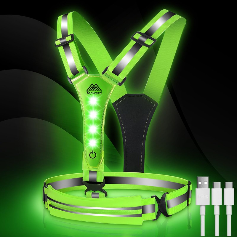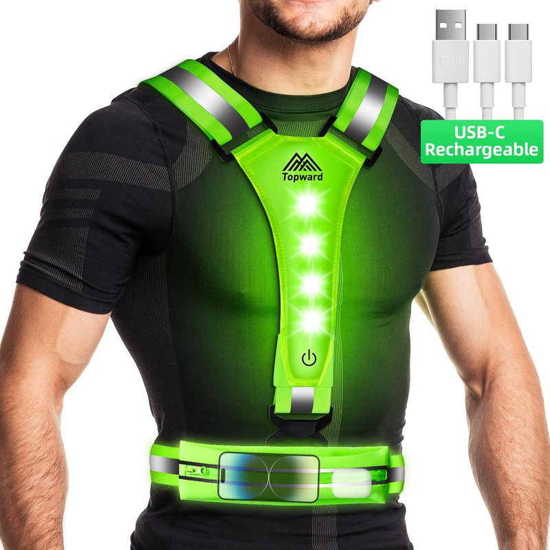 Topward LED Reflective Vest Running Gear, USB-C Rechargeable, Light Up Lights for Night Dog Walking Cycling, Running Phone Holder Vest for Runners, High Visibility with Adjustable Waist/Shoulder