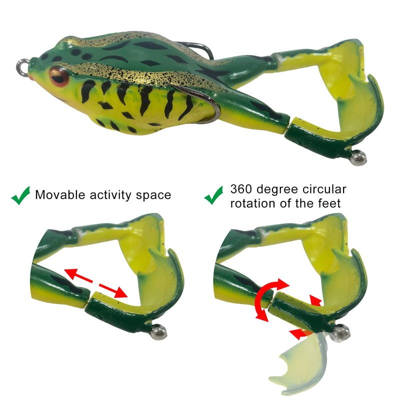 • 【Double Propeller Frog Legs】This top water frog features double 360° rotatable propeller legs, creating realistic splashes and water disturbance to trigger aggressive strikes. Perfect for frog lures for bass fishing, pike, and snakehead!