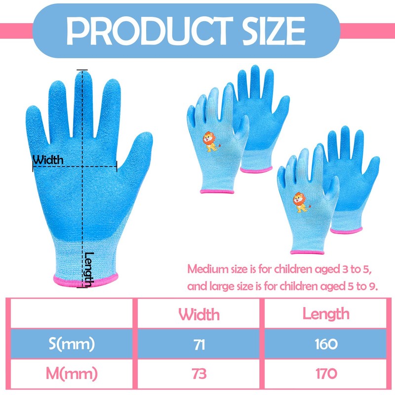 - 6 different colors pack and two sizes available: kids gardening gloves are brightly colored and printed with cute patterns, 6 combined pack and animal patterns for your chioce. The S size is for children aged 3 to 6 and the M size is for children aged 5 to 9. They are pack of two pairs of pink children's gloves, 2 pairs of green gloves, 2 pairs of pink children's gloves, 1 pair of pink children's gloves, 1 pair of green + 1 pair of blue children's gloves, 1 pair of blue and 1 pair of pink children's gloves.