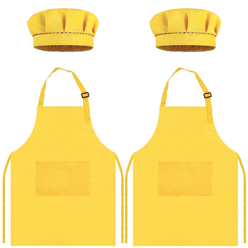 TOPWAYS Kids Apron and Chef Hat Set, kids Aprons for Cooking 2 Pack, Adjustable Toddle Kitchen Chef Apron, Kids Artist Painting Apron Bib with Two Pockets for Kids 3 4 5 6 years (2 x yellow, L)