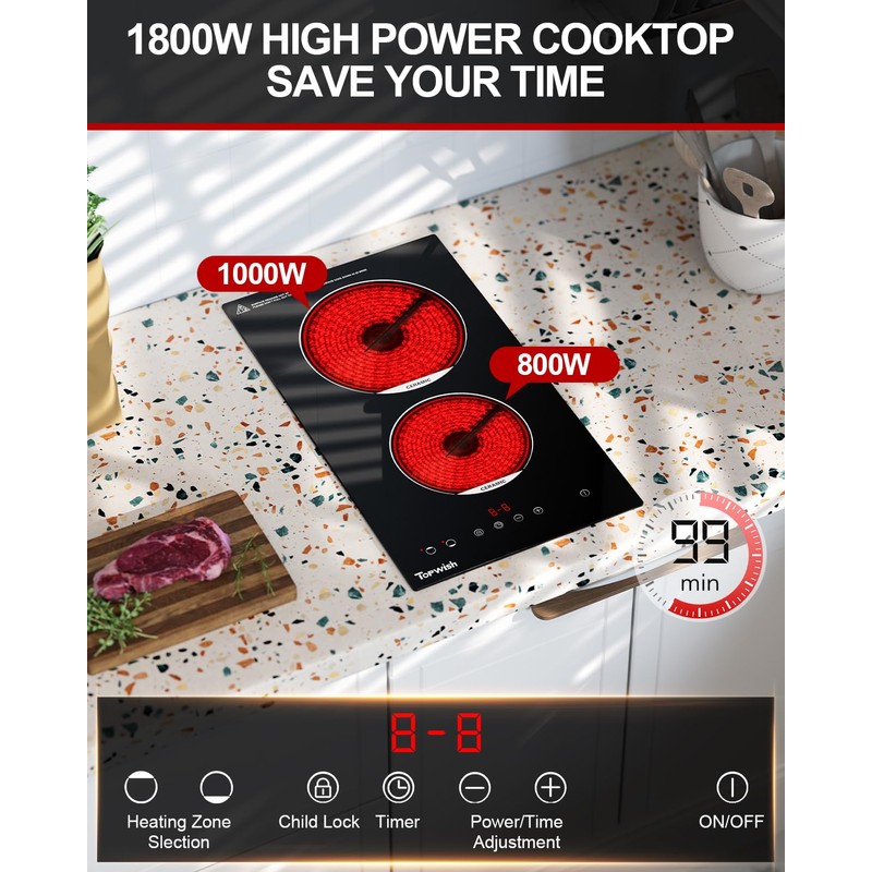 • 9 Power Levels Electric Radiant Cooktop - This electric cooktop 2 burners operates at a powerful 1800W. The 2 burners include a 1000w and a 800w units, providing rapid and efficient heating for all your cooking needs. With a total of 9 power levels to choose from, you can easily cook, simmer, steam, slow cook, and stir fry. You can set the timer to turn off automatically, the timer range is 0-99 minutes