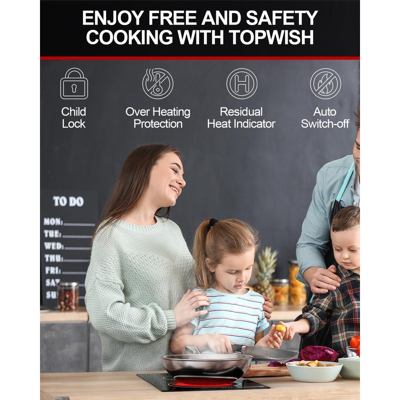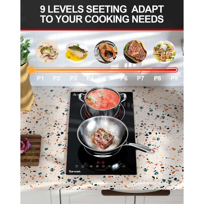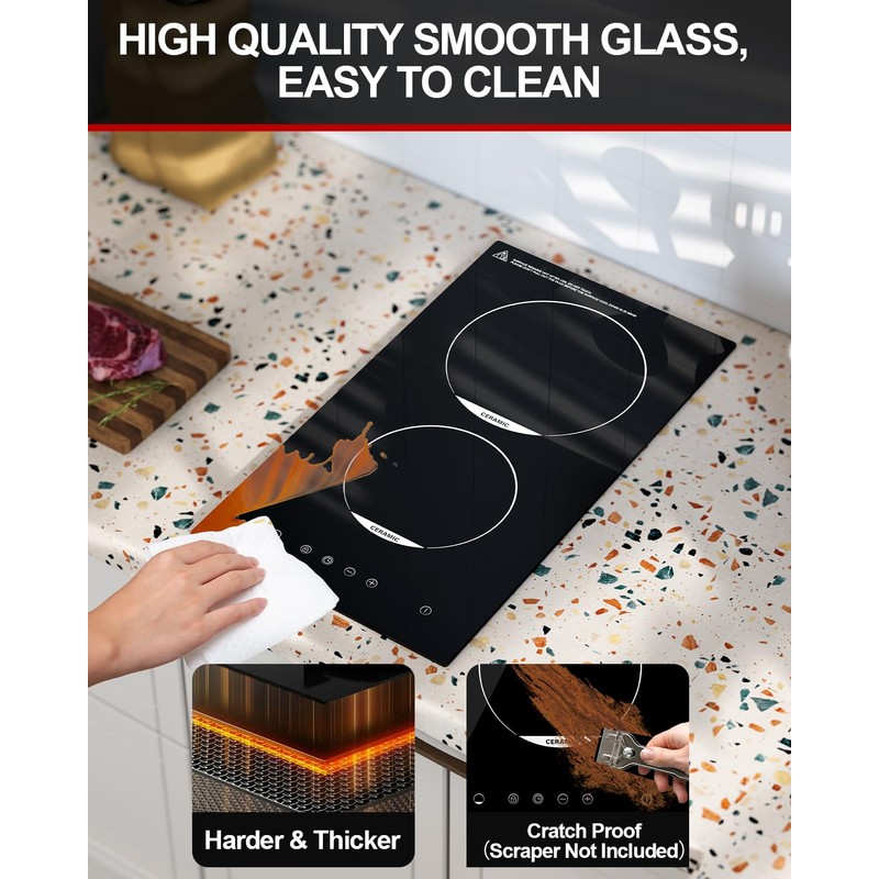 • Safe, Multifunctional Electric Stovetop - Each burner corresponds to an independent operating area and it is very simple for anyone to use the dual ceramic cooktop. The two burner electric cooktop is very safe for it has various safety protection functions, such as child safety lock, 99 mins timer, auto shutdown, residual heat warning and pause function. Pregnant women can also use the electric cooktop 2 burners with confidence