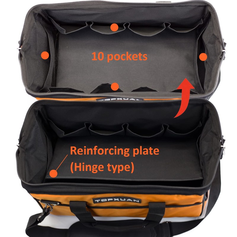 - MULTI-POCKETS &LARGE MULTI-SPACE:our tool bag has 10 pockets inside and 8 outside pockets to organize different categories Hand tools or tool accessories. The top opening has a built-in wire frame,which effectively enlarges the size of the opening and is convenient for placing and removing tools