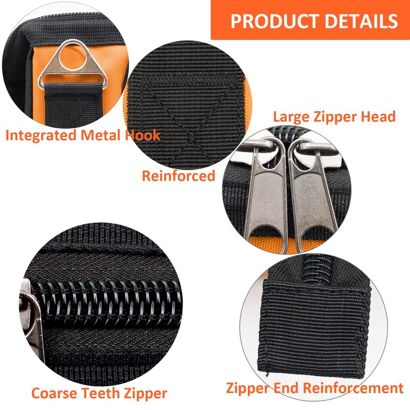- 【WEAR-RESISTANT&WATERPROOF】 The exterior of this tool bag is made of 900D orange Oxford cloth, while the interior is lined with 600D Oxford cloth. Both contain lining layers in the middle to boost overall rigidity, double waterproof, and exceptionally abrasionresistant.