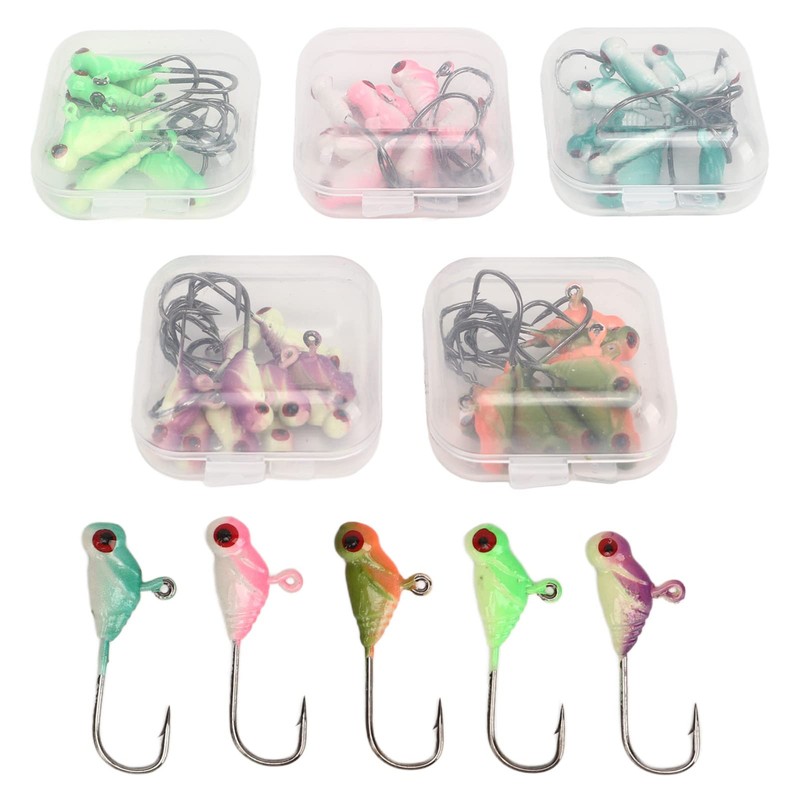 The Ice Fishing Jigs set includes 50pcs of mixed color jigs with a storage box. Made with high carbon steel material, these jigs are and durable. Suitable for both freshwater and saltwater fishing. Each jig has a barb to reduce the chances of unhooking. Perfect for bass, trout, crab, carp, and more.