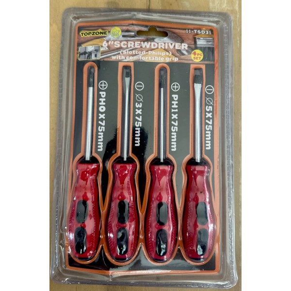 Topzone 4 Piece Set 6 inch screwdriver set (Slotted Phillips) with comfortable grip