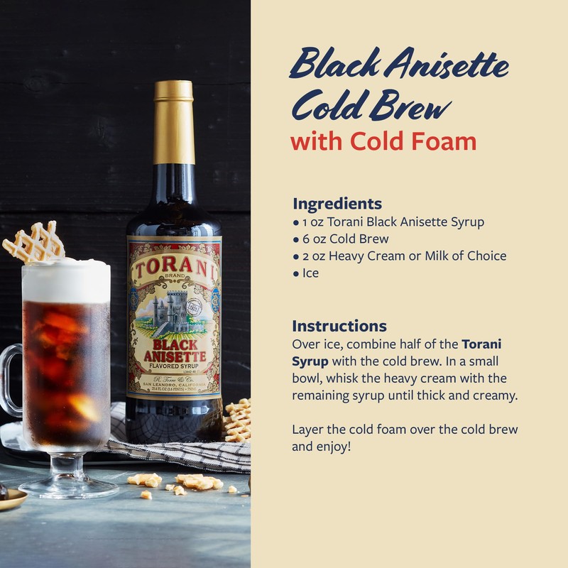- NEW BLACK ANISETTE SYRUP: Celebrate 100 years of Torani with the release of one of our original flavors reinvented for today’s taste. This alcohol-free, herbaceous flavor features timeless notes of licorice and earthy florals.