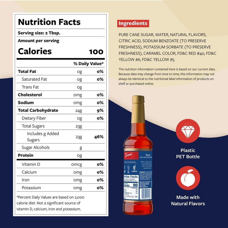 - CONVENIENT & MESS-FREE: The large 750 ml Torani Peach Syrup bottle, made of BPA-free plastic, comes with a high-quality pump for perfect portion control and effortless sweetening.