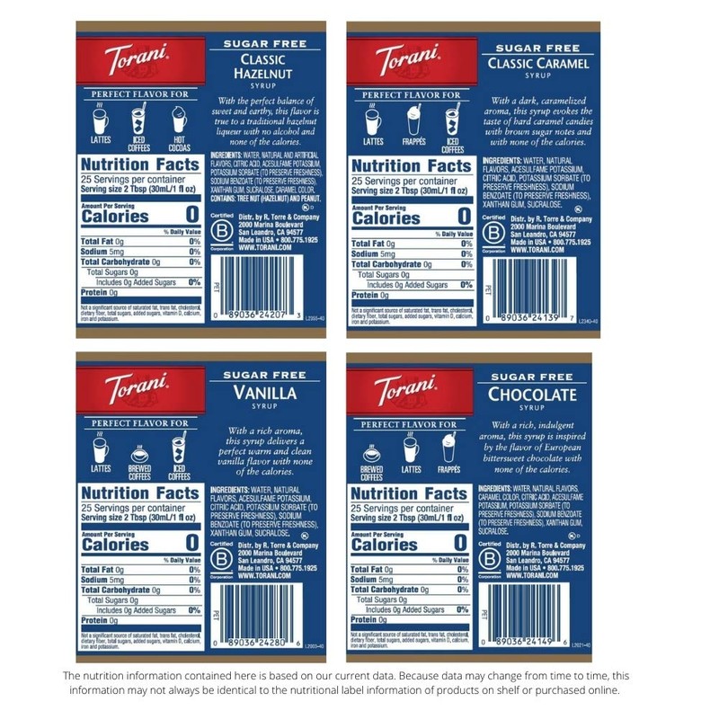 • Sugar Free Variety Pack: This zero calorie coffee lover syrup set contains 1 24.5 ounce bottle of each of the following keto friendly flavors: Vanilla, Classic Hazelnut, Classic Caramel, and Chocolate