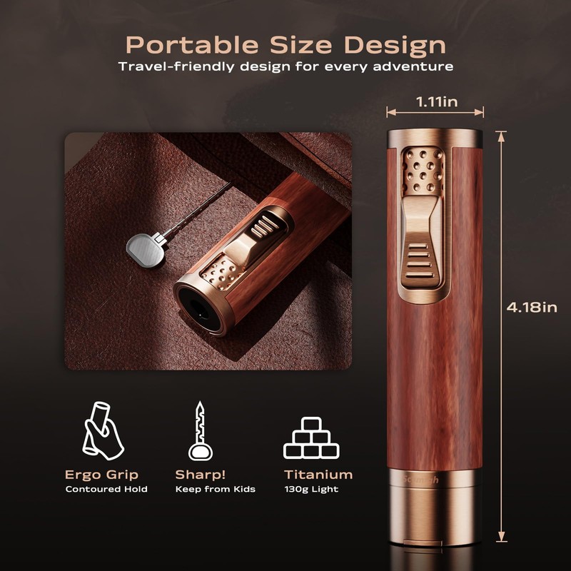 - 【Thoughtful Gift Choice】 This exquisite wood grain torch lighter measures only 4.18*1.1*1.1in and weighs only 0.29 Ib. The compact body fits perfectly in your palm and can be easily put into your pocket or carry-on luggage. The cool lighter contains a hidden punch and draw enhancer. It perfectly combines elegance and practicality and comes with gift box packaging. Whether it is Father's Day, Thanksgiving, Christmas, New Year, or other special occasions, it is a great gift for friends and family