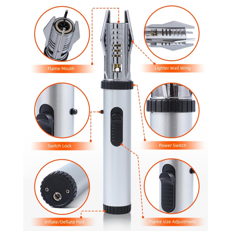 - 【Refillable & Adjustable Flame】Our butane torch lighter is refillable, allowing you to easily replenish gas when needed. Adjust flame height via the fuel wheel: (+) to increase, (-) to decrease. Features a safety lock to prevent accidental ignition and misuse by children, ensuring safe and reliable performance. Perfect for cooking, grilling, and crafting. (Butane gas not included due to shipping regulations.)