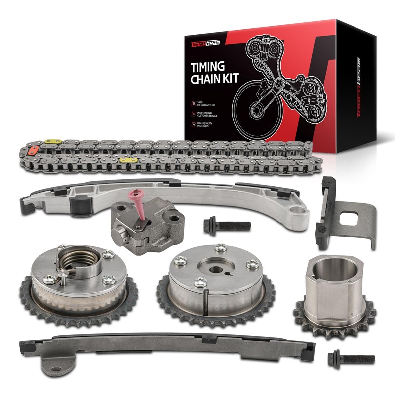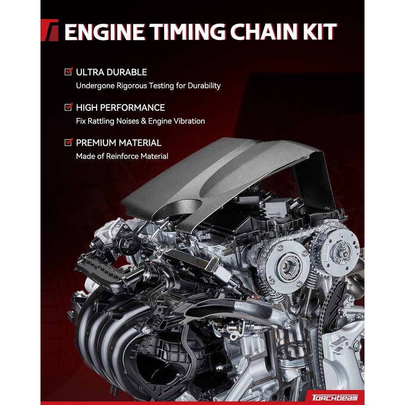 - [Kit Contents]: Torchbeam Engine Timing Kit includes OE matched components: 1x Timing Chain, 1x Timing Chain Gear, 1x Left Timing Chain Guide, 1x Right Timing Chain Guide, 1x Upper Timing Chain Guide, 1x Timing Chain Tensioner, 1x Intaket VVT Sprocket, 1x Exhaust VVT Sprocket - all packed in one convenient box, ready to install