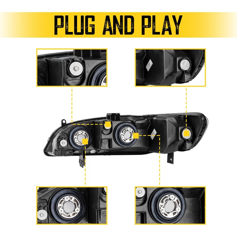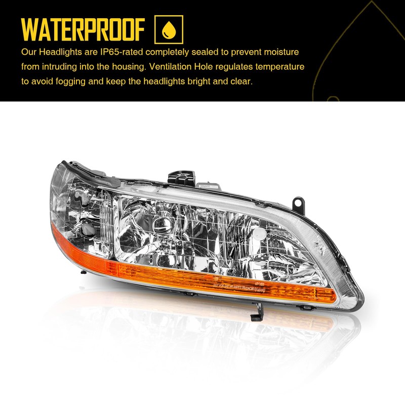 - 【IP65 Excellent Waterproof】Headlights assembly are made of fully sealed ABS plastics with tensile/impact strength. Pair front light compatible with 2000 Accord. IP65 waterproof level, even brief immersion in 1 meter of water on rainy days will not cause harmful effects. The headlight assembly interface uses fully sealed silicone resin to enhance airtightness, excellent sealing avoids any water accumulation in the lamps. Headlight assembly compatible with 2001 Accord offer enhanced road illumination and improved visibility, achieve more time to react and make drive safer.