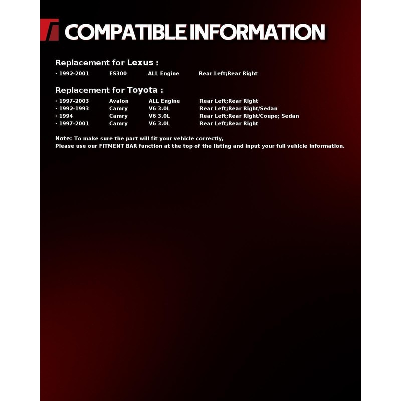 • 【FITMENT】 Torchbeam Complete Struts Shocks Absorber with Coil Spring Assembly Compatible with Toyota Avalon 1997-2003, Toyota Camry 1992-1994 1997-2001, Lexus ES300 1992-2001.