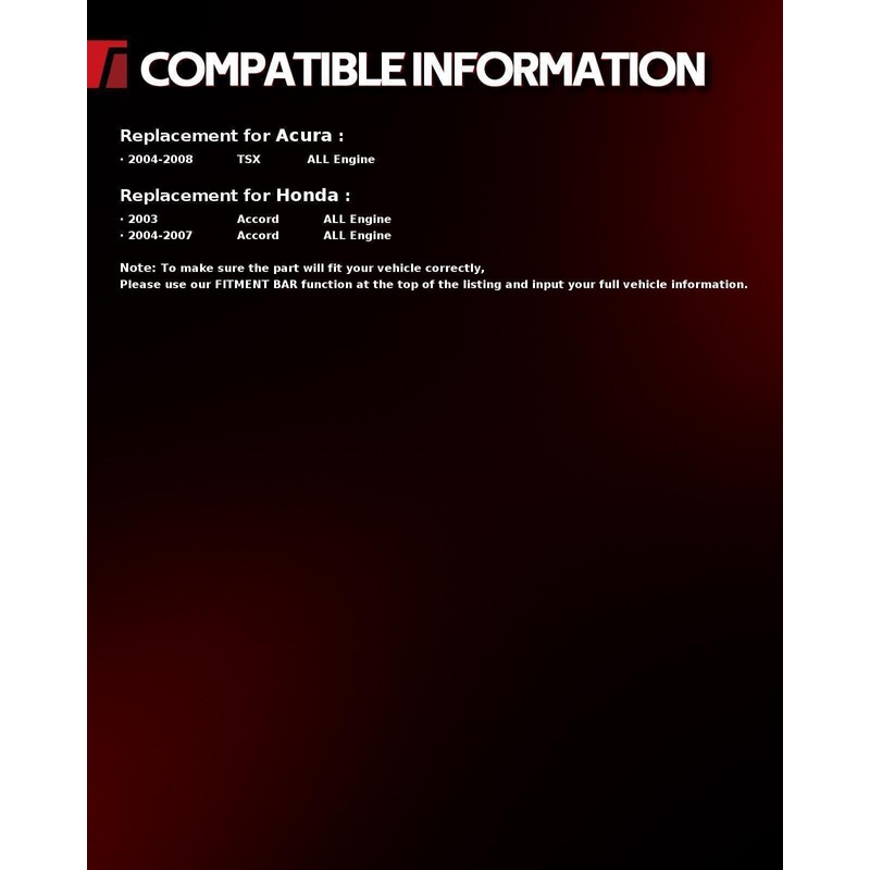 • Fit ModelReplacement for 2003-2007 Hon-da Accord, 2004 2005 2006 2007 2008 Acura TSX NOTE: Please check with the "Amazon Confirmed Fit" or the detailed fitment info in the production description below to make sure that is the correct part for your vehicle