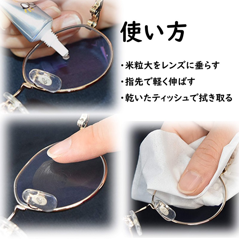 - Gel type eyeglass lens strong anti-fog It will keep the anti-fog effect in just one application. Apply a large rice grain liquid on both sides of the lens and apply the liquid with tissue paper or soft cloth. The gel remains on the surface of the lens for a long lasting effect (results in a small amount. )