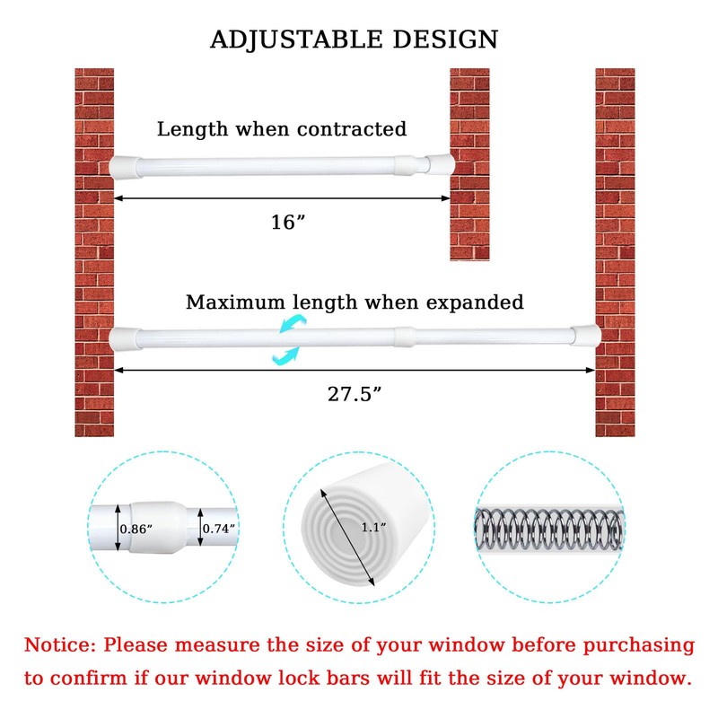 - Window Door Security Bar: Our adjustable window lock bars can securely lock the sliding door in place to improve window security, maximum adaptability to fit most window or sliding doors. Notice: Please measure the size of your window before purchasing to confirm if our window lock bars will fit the size of your window