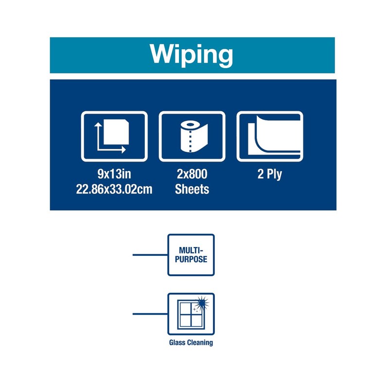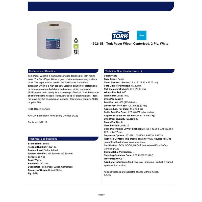Tork 130211B Paper Wiper, Centerfeed, 2-Ply, 9.00" Width x 866' Length, White (Case of 2 Rolls, 800 per Roll, 1,600 Wipers per Case)