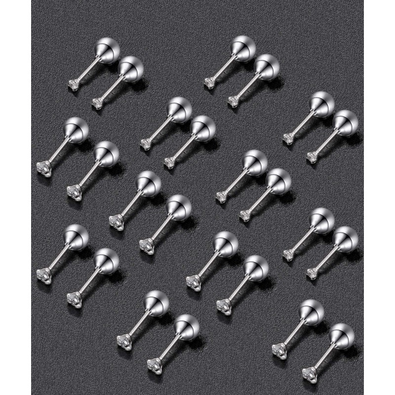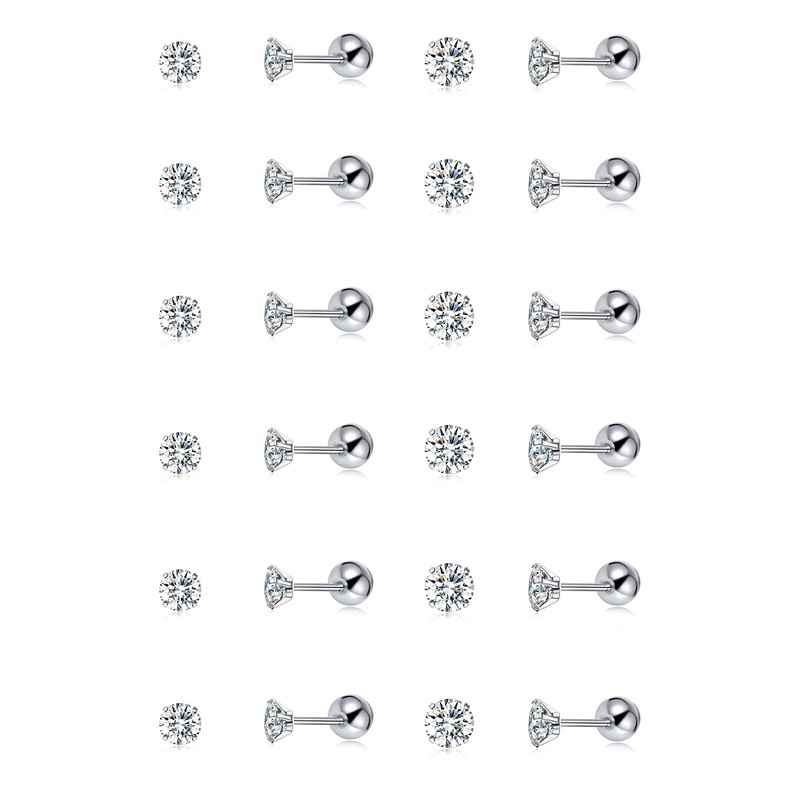 Tornito 12 Pairs 20G Stainless Steel Stud Earrings Round Cubic Zirconia Barbell Stud Earrings Set For Men Women 2MM-3MM